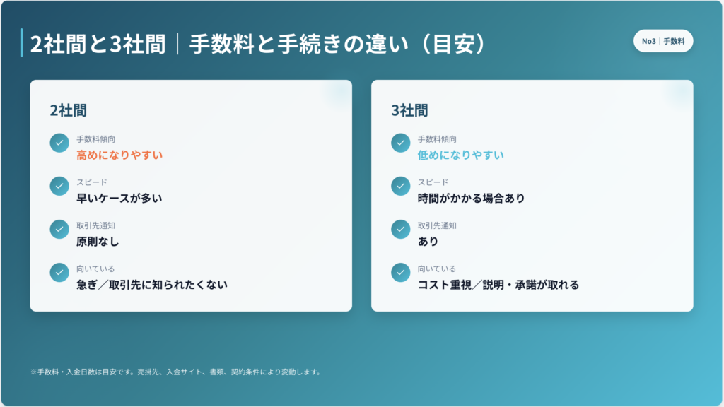 一見すると3社間のほうが得に見えますが、「明日までに資金が必要」など緊急度が高い場合は、2社間のほうが資金繰り上は有効なこともあります。コストとスピードのバランスで判断しましょう。